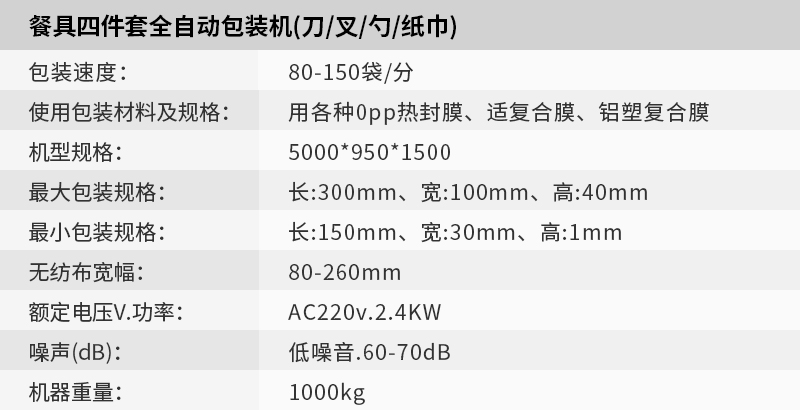 2、纸巾自动折叠分切,刀自动下料,勺子自动下料,叉子自动下料,纸巾自动下料,自动化程度高。