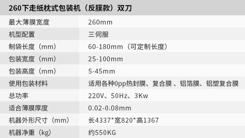 这款下走纸枕式反膜包装机整机采用三伺服驱动,具有独立控制,进料检测,防空包防切功能;输送方式根据物料输送,自动定位、进料,可连接物料不同输送来物料识别;机器外形采用不锈钢结构,设计流畅,美观,操作方便;高感度观点眼色标跟踪,数字化输入封切位置,是封切位置更加准确;可同时兼容多种规格产品包装,调节方便;可选择打码、喷码等辅助功能;所有控制有软件实现,方便功能调整和技术升级,永不落后。