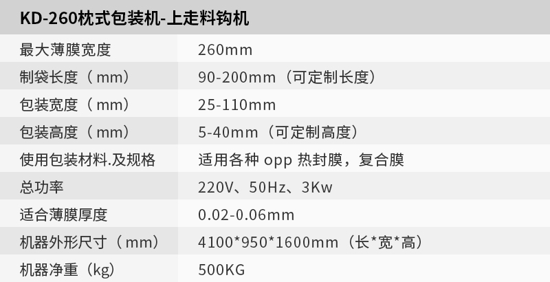 KD-260上走纸料勾枕式包装机